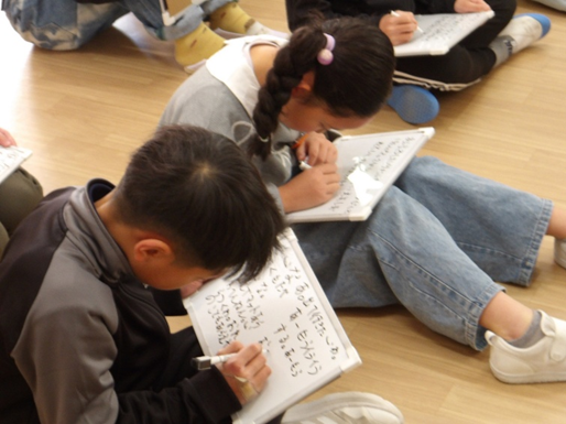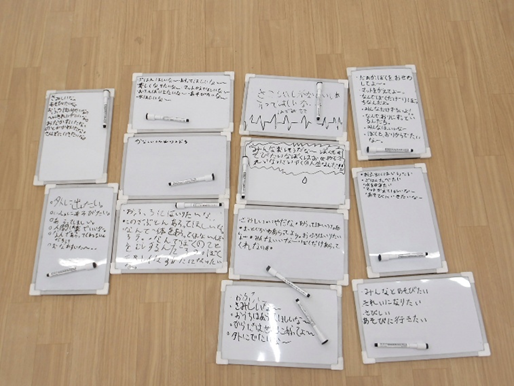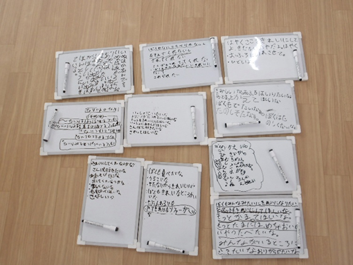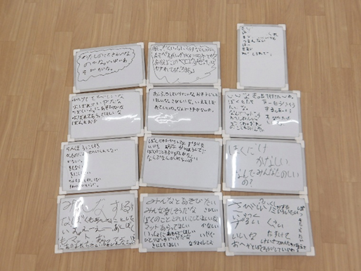 この時にミニホワイトボードを使います。挙手をしてみんなの前で自分の意見を述べるのが恥ずかしかったり、苦手な子どもにとっても、「書く」という方法を通して自分の意見を表現することができます。
