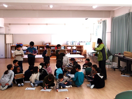 まずはプログラムⅠの振り返りを行います。「街」「牧場」「自然」の3つのすみかに住む動物たちは「ペット」「家畜」「野生動物」に分けられ、私たち人間はどの動物たちとも深く関わってることを子どもたちは覚えていてくれました。