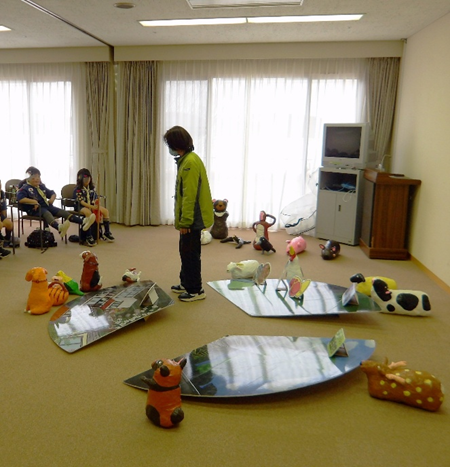 子どもたちは私たちの身の回りの場所の「街」「牧場」「自然」の3つのすみかに動物を分類し、動物がどこに住むべきかを2人1組で話し合いながら張り子の動物を移動させました。