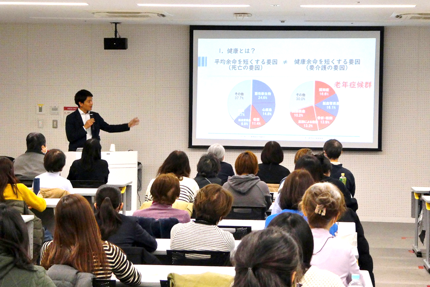講演ではまず、「寿命」と「余命」の違いについてわかりやすい説明がありました。寿命は生まれてから亡くなるまでの期間、余命は今の年齢からあとどれくらい生きられるかを示すもので、65歳では女性が約25年、男性が約20年とされています。また、その中には健康に過ごせる「健康余命」と、介護が必要になる「不健康余命」があり、不健康余命は平均5~8年ほどあるとのことでした。その期間が長くなる人は認知症や転倒・骨折などが主な要因になるそうです。