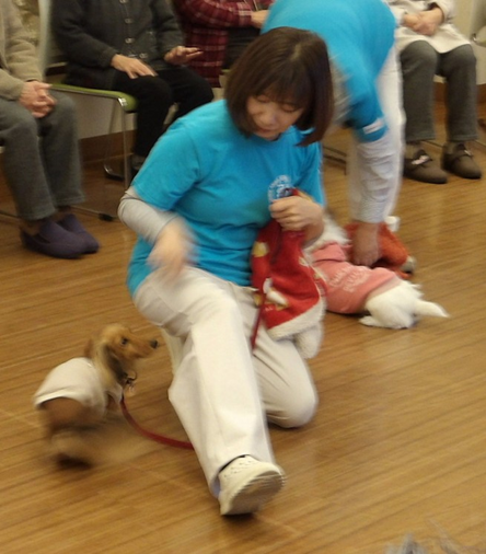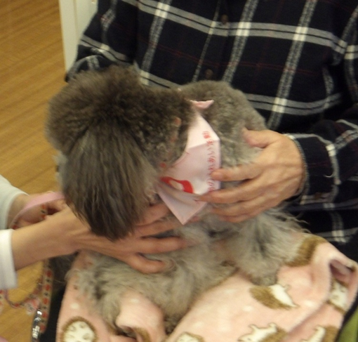 それからお一人おひとりに「わんちゃんは大丈夫ですか」などの確認をしてから膝の上にタオルなどを敷いてわんちゃんを膝へ。「温かいでしょ」「久々の抱っこどうですか」と優しい声での声掛けに、皆さんは懐かしい思い出話しを話してくれたり、思い出して涙される方もいらしゃいました。施設のスタッフの方は声掛けやカメラマン役で大忙しでしたが、皆さんの良いお顔の写真が撮れたのと、普段とは違う表情のみなさんが見られたようで会場全体があたたかな雰囲気に包まれました。