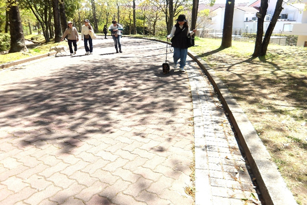 4月16日(木曜)、今年度初の「お散歩診断」を開催しました。講師に渡辺ひろ子先生をお迎えし、暑いくらいのお天気の中、犬7頭と飼い主さん11名が先生から個々にリードの長さや首輪の緩みのチェックをしてもらいました。そして先生から今日は犬同士の挨拶はしない。リラックスして散歩しましょう」と課題を受け、いざ出発!