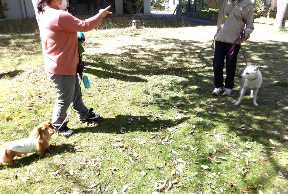 ゲームのひとつに、各自ウンチ袋7枚を受取ったら、飼い主同士で向き合ってジャンケンをして、勝ったら1枚もらうというゲームがありました。その時に犬同士は正面で向き合わせない、吠えたり飛び掛からないように距離を判断し、リードも短く持ってお利口になったらジャンケンをするなど、注意を聞いてから始まりました。