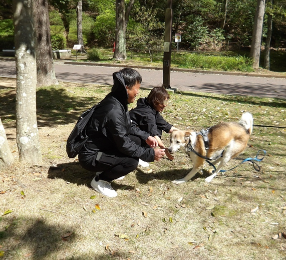 先生より「犬の言う通りばかりせず、人間の都合ばかりでもない50対50(フィフティフィフティ)の関係を作っていってください。人間が犬に「こうしてください」と教えないと分かりません。そこで犬は自分で解決しようとするから走ったり、引っ張ったりするので、止めるべきところは止める、走らないで歩いて欲しところは歩かせる、それをしてくれたら「ありがとう」といっぱい褒めてあげる。お互いで交渉をしながら関係性を築いてください」とお話しいただきました。